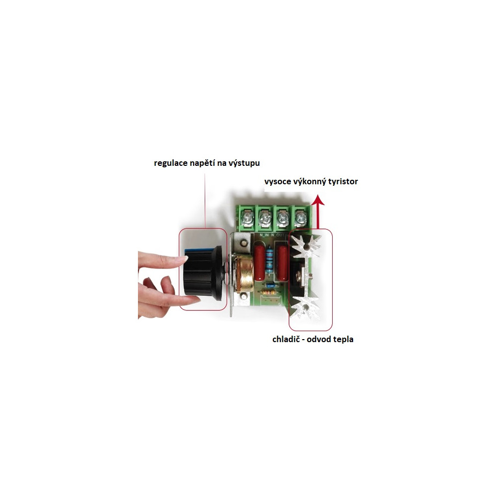 Specifikace: Napájecí napětí: 250VAC Max. zátěž ve špičce max 25A, zátěž max 2000W (odporová zátěž). Účinnost: více než 90% Regulace výstup.napětí: AC 50–220V Rozměry 48x35x6mm Externí potenciometr připojený vodiči s konektorem, délka cca 20cm