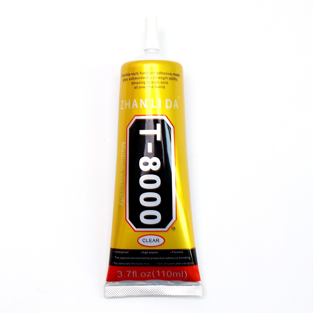 Univerzální pružné epoxidové lepidlo Zhanlida T-8000 110ml čiré barvy, bez nádechu žluté a bílé barvy, s nízkým zápachem, střední viskozitou, rychlezavadající - 3 až 5 minut, během kterých dochází k pevné vazbě a zároveň je možnost lepený předmět pozicovat.