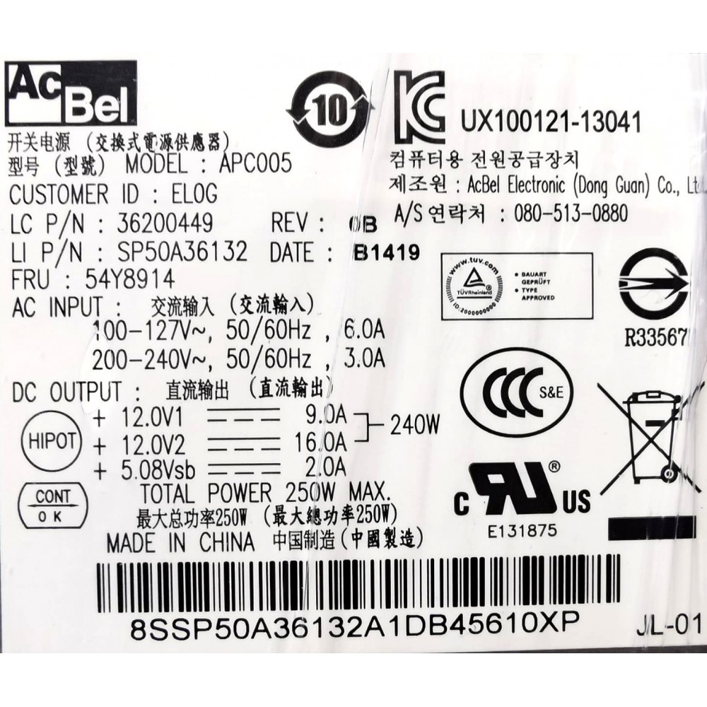 250W, PN: 36200465, HKF2502-3A, DPS-250AB-71B, DPS-250AB-71A, PS-3251-01, FSP250-20SI, 36200449, SP50A36132, 54Y8914