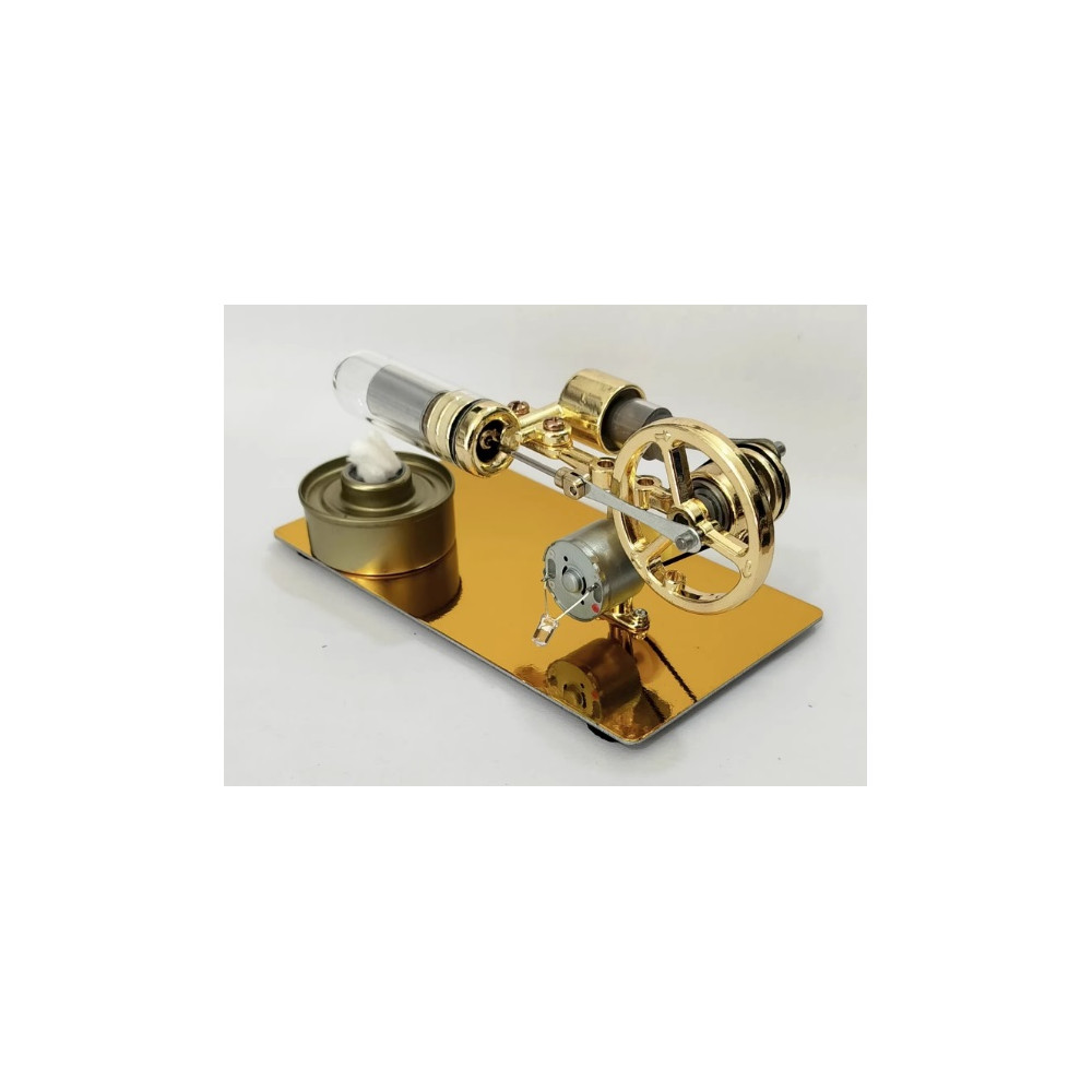 Anleitung – Reinen Alkohol (vorzugsweise 98%ig – nicht im Lieferumfang enthalten) in den Brenner füllen und unter den Zylinder stellen. Den Brenner anzünden; nach kurzer Zeit setzt sich alles in Bewegung. Die Glühbirne an den Motorgenerator anschließen; die Polarität ist unerheblich.