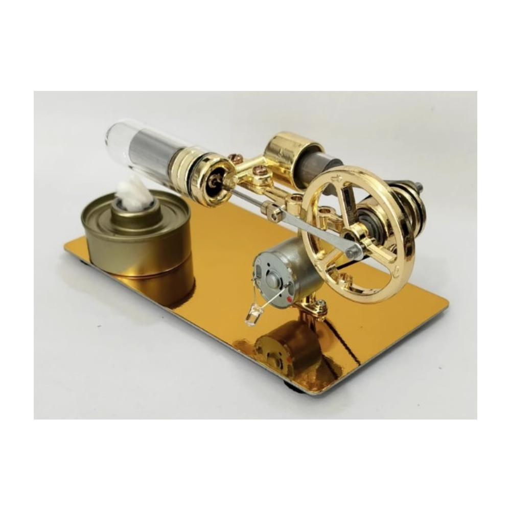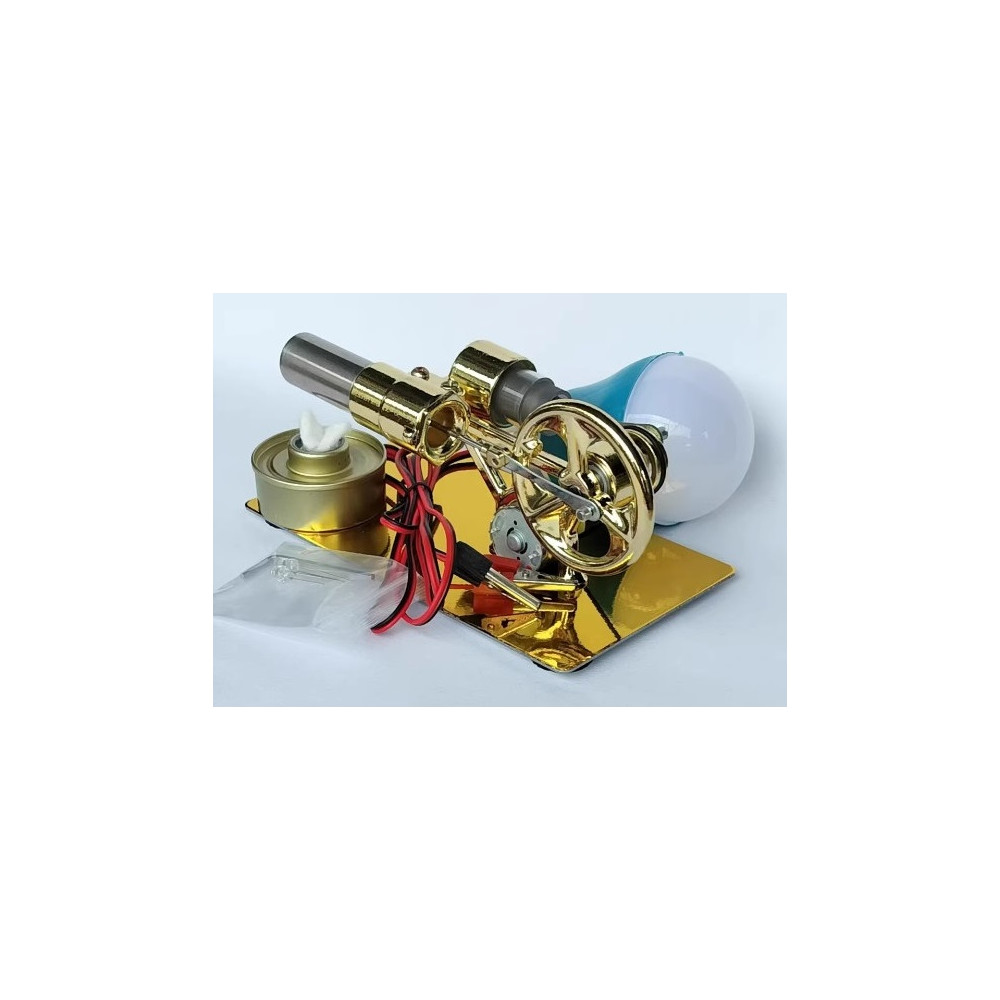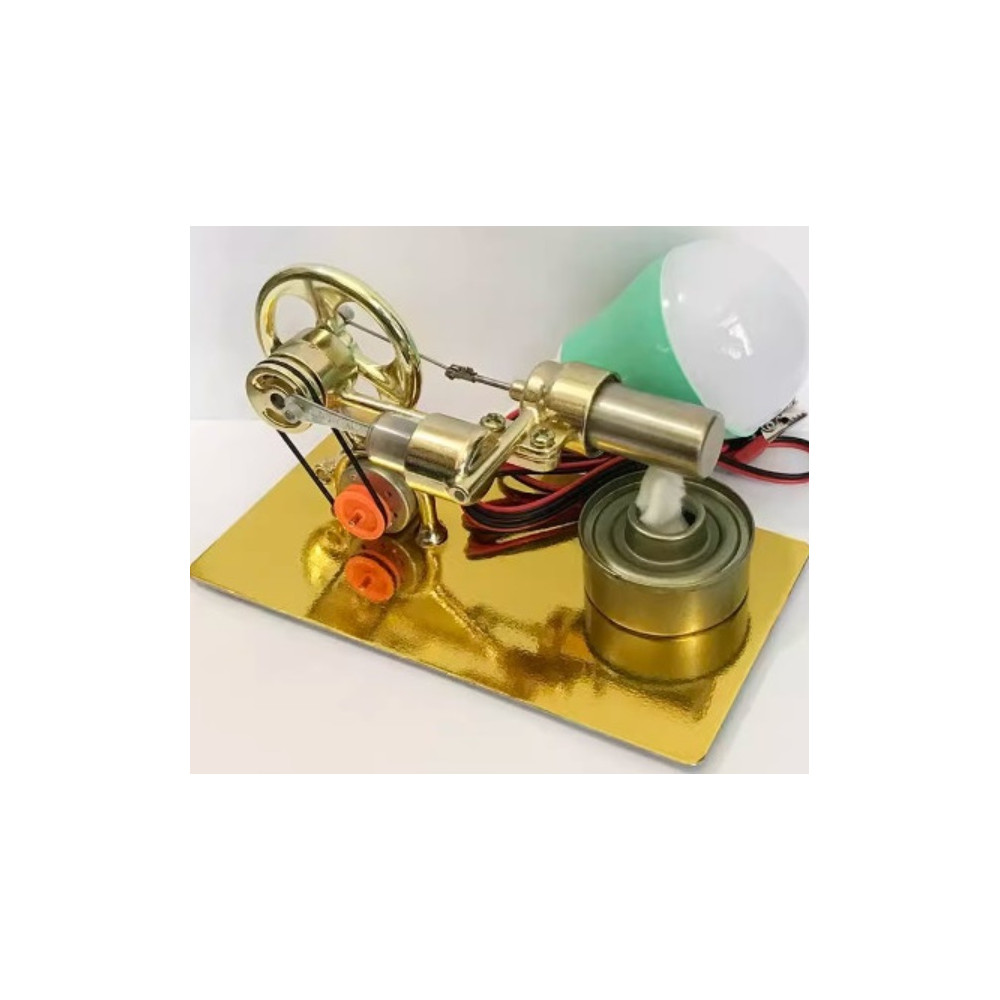 Stirlingmotor mit Stromgenerator – bringt eine Glühbirne zum Leuchten.