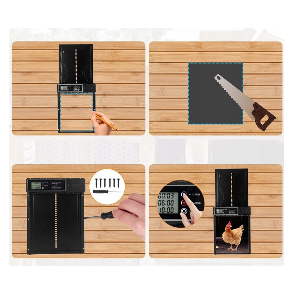 Der integrierte Timer ermöglicht die präzise Einstellung der Öffnungs- und Schließzeiten im 24-Stunden-Modus. Die Bedienung erfolgt über einen Knopf und ein gut lesbares LCD-Display. Die Tür öffnet und schließt sich automatisch zur eingestellten Zeit, ohne dass ein weiteres Eingreifen erforderlich ist.