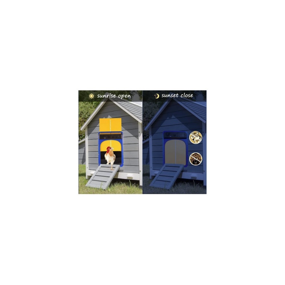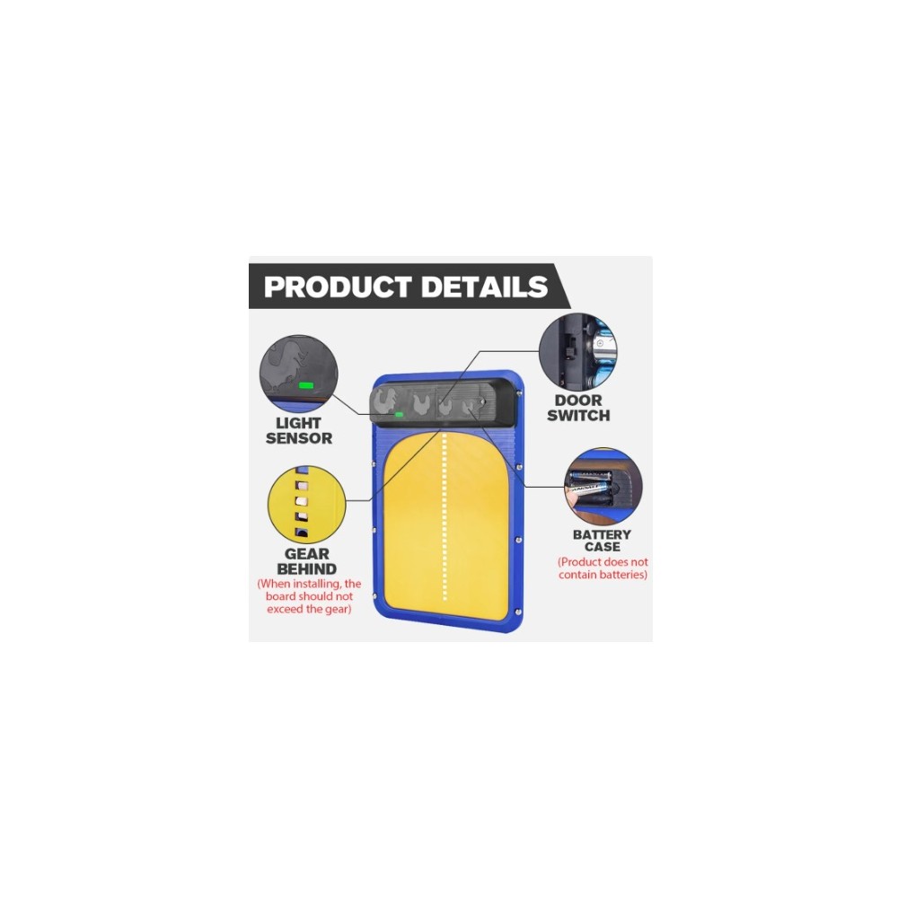 Automatic chicken coop door Material: Black blue orange plastic Size: see fig. Product 400g / Including inner box 480g Battery: 3 AA batteries (not included) Magnet: Motor with magnet function: light sensor, lifting, waterproof (IP44)