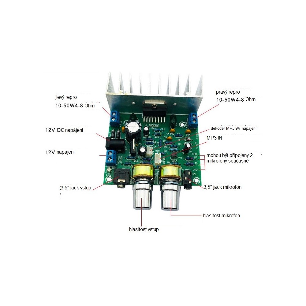 TDA7297 dvojkanálový zosilňovač, výstupný výkon 15W + 15W, požadovaný napájací zdroj AC 12V alebo DC 12V / 2A min, (25W), pre repro 10-50W, kvalita zvuku výborná, pomer signál / šum je vysoký .., Podporuje kondenzátorové mikrofóny, menovite elektretové mikrofóny, ale nepodporuje dynamické mikrofóny. Táto doska je tiež vybavená 9V napájacím zdrojom a vstupnú audio konektorom pre napájanie dosky dekodéra MP3.